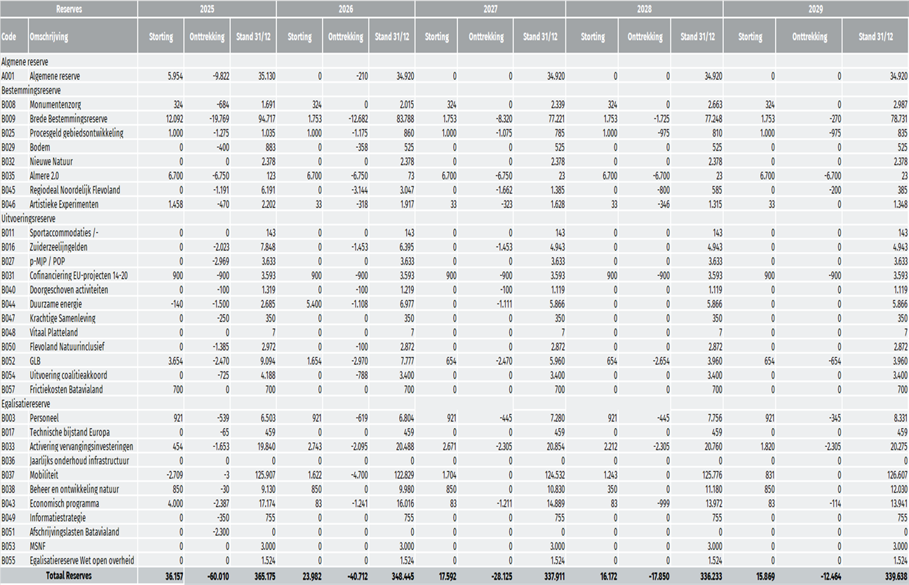 Eens in de 4 jaar wordt een nota reserves en voorzieningen uitgebracht, waarin het beleid wordt uiteengezet. In deze begroting is uitgegaan van de 'Nota Reserves en Voorzieningen 2020-2023' die op 13 november 2019 is vastgesteld. Voor alle bestemmingsreserves geldt dat het saldo van de reserve beschikbaar is voor de benoemde bestedingsdoelen. Voor een deel zijn de hierin opgenomen middelen al geoormerkt voor specifieke activiteiten. In deze bijlage is van iedere reserve en voorziening een detailoverzicht van het verloop in weergegeven, inclusief eventuele resterende oormerken per peildatum 31 december 2026. Dit betreft een moment opname, voor veel van deze oormerken is ook na 2026 al een onttrekking/besteding in de begroting opgenomen.